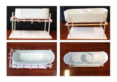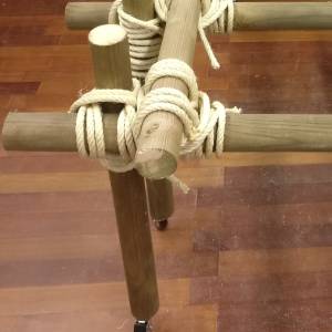 The supporting structure of the prototype was first built with ropes as connectors for the wood used in replacement of the bamboo in the actual product. The simulation did not go as predicted because of the wheels used for transportation, as they made the legs unsteady. Thus, the team improvised the connections with wood screws, but this will not be a problem with the actual product as it does not require wheels and the shape of the connector prevents the legs from sliding. Figure 43 shows both options.