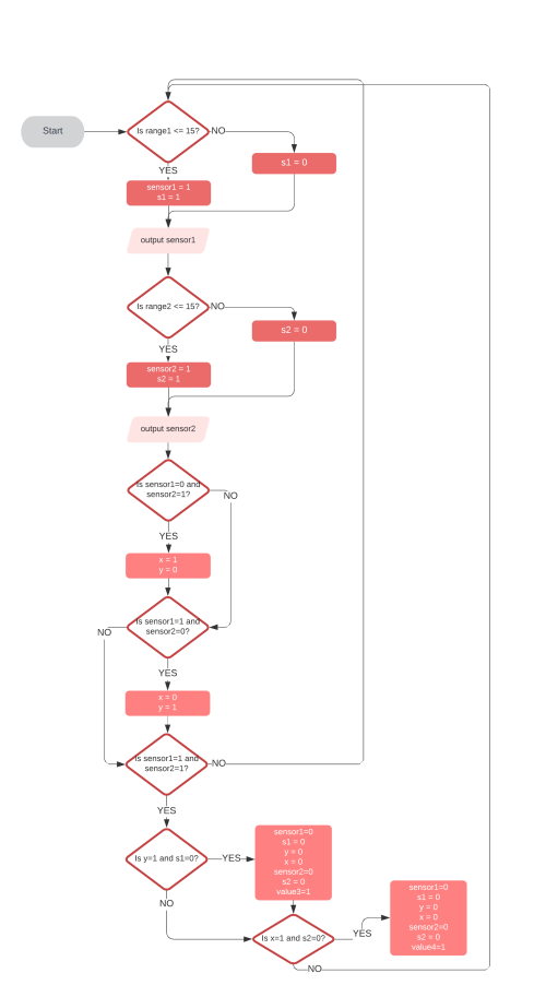 Finally, regarding the time-of-flight sensors, it is necessary to read the data and define the direction of the movement based on which sensor is activated first. This procedure is completed within the function “read_dual_sensors()” presented in Figure 50 and explained in the flowchart in Figure 51.