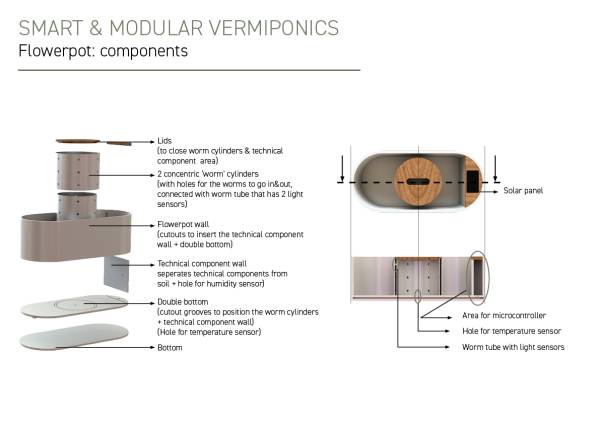 Starting from the general theme ‘smartification of everyday objects', we developed our brand ‘Wormify’. Our solution is based on a modular, easily movable Keyhole Garden, which takes advantage of vermicomposting to assist in fertilizing the plants. A temperature sensor, a humidity sensor and light sensors are integrated into the design to assure optimal, environmental circumstances for vermicomposting and plant growth. Furthermore, the system will also have a rainwater collector with a filter for pollutants in case the water is not safe for the environment. The user is notified by the website/app if he needs to intervene in the system. The product is powered by an integrated solar panel and battery.