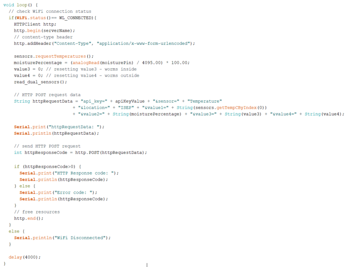 Finally, the “loop()” function presented in Figure 52 is a continuous loop that reads the values from the sensors every four seconds and sends these to the server.