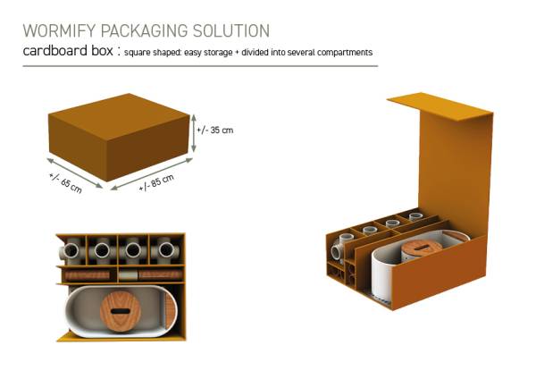 The vermiponic system is packed in a simple, corrugated cardboard box. The cardboard is compostable and can be reused to facilitate the composting process. The box is square-shaped which is good for efficient storage and transport. The cardboard box will be delivered to the user with a bag of potting soil and a bag with the worms. An actual prototype was built to show the proportions and functionality of our design.
