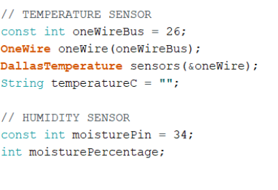 The code presented in Figure 48 establishes the pins to which the temperature and soil moisture sensors are connected and creates the necessary variables to read the data.